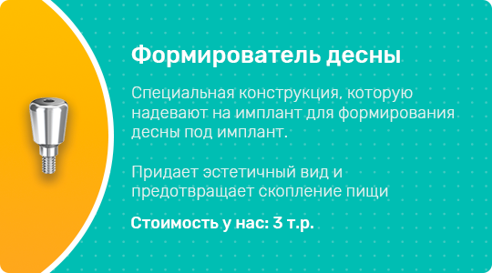 В зависимости от ситуации и вида импланта и имплантации после установки импланта ставят временную коронку или только формирователь десны и накладывают швы.